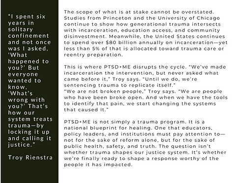 Unresolved trauma - especially the kind that begins early in life or continues for years - drives the same chronic diseases that are killing our people every day: heart disease, diabetes, respiratory failure, and cancer. And when you look at the communities most impacted by incarceration, you'll find those same communities carrying the heaviest loads of trauma. Not as a one-time event, but as a constant atmosphere.